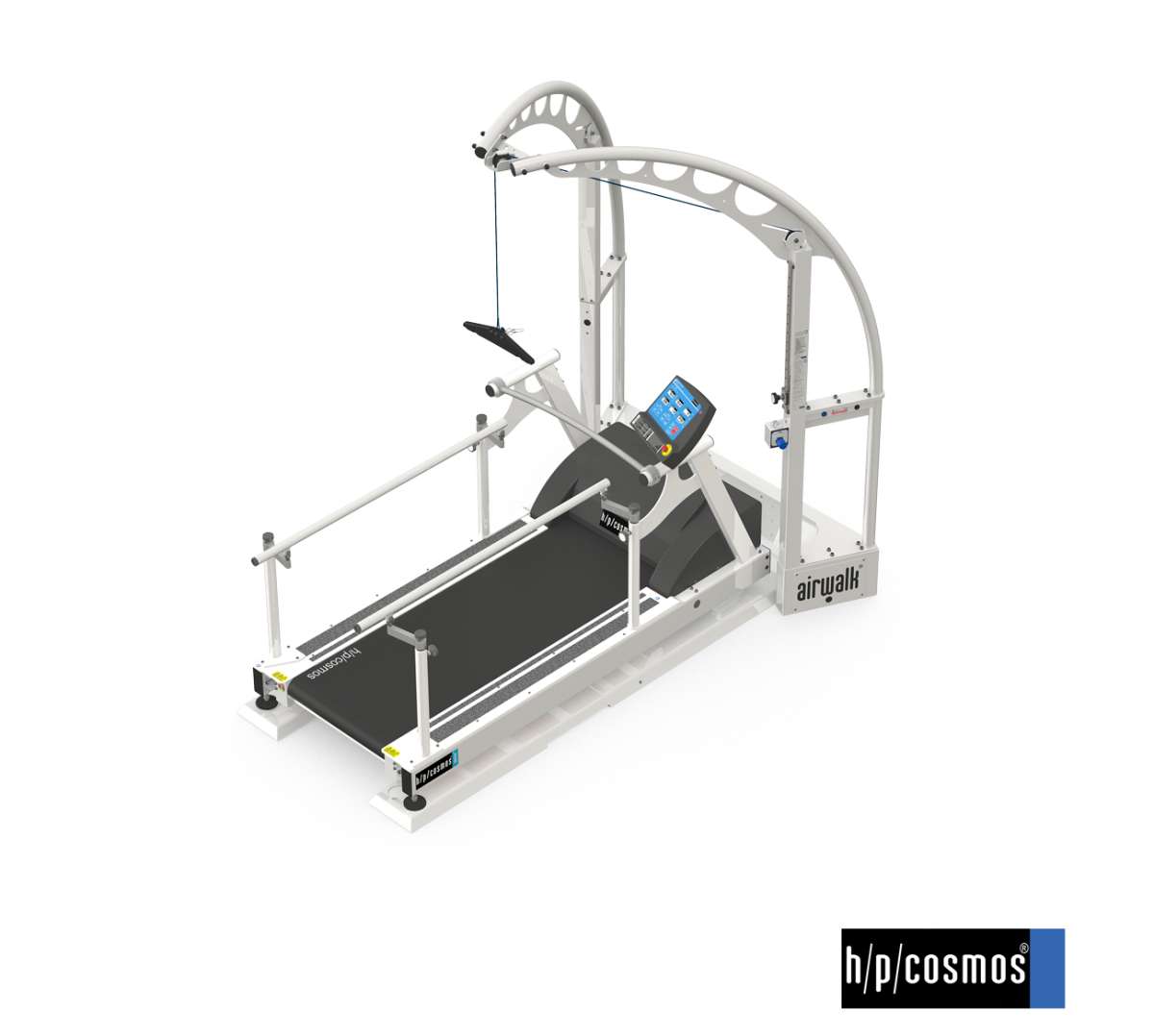 The h/p/cosmos Airwalk® Unweighting system uses pneumatic power provided by a small compressor (optional equipment at extra charge) and the h/p/cosmos airwalk Vest to support the patient.